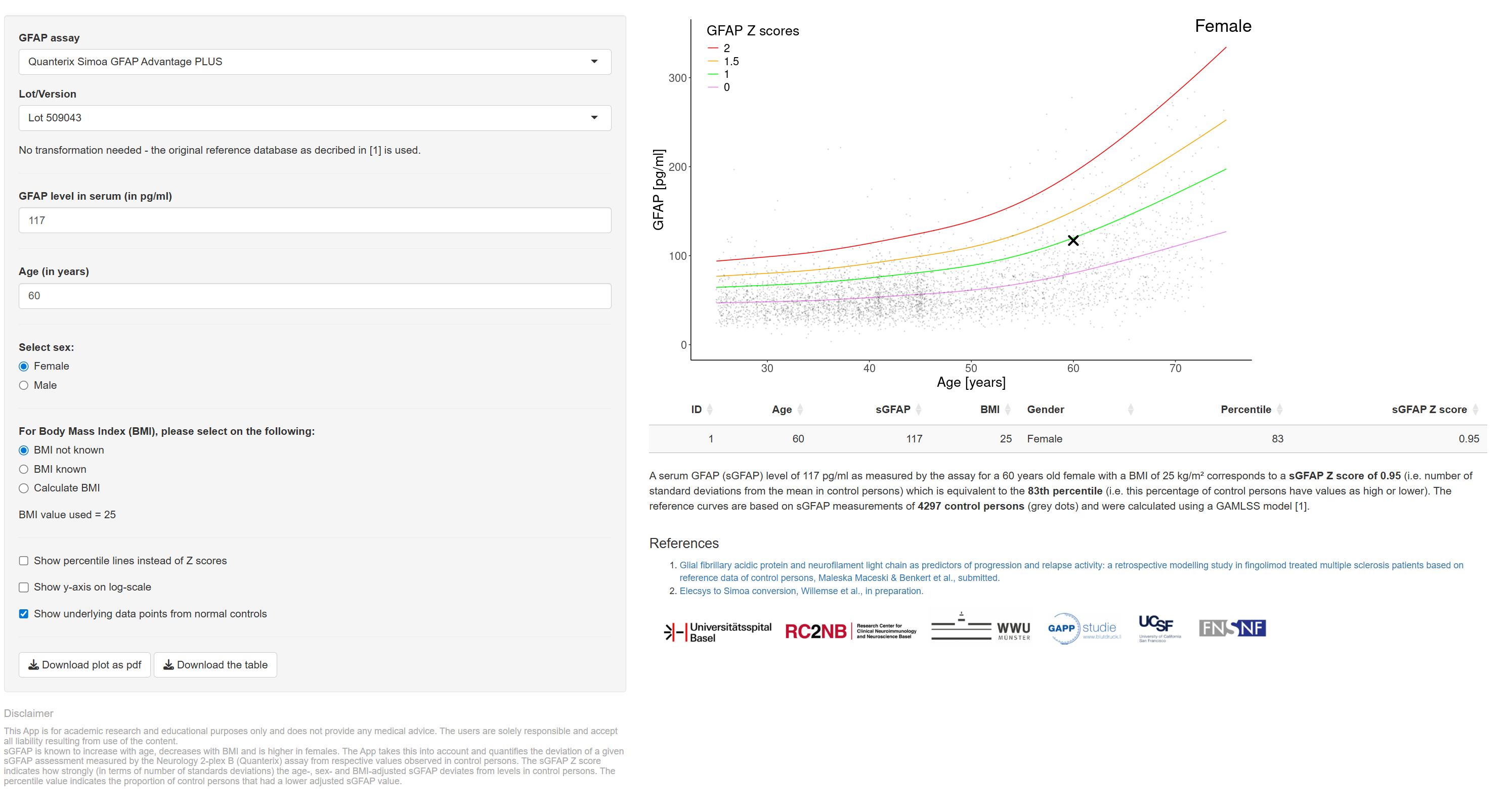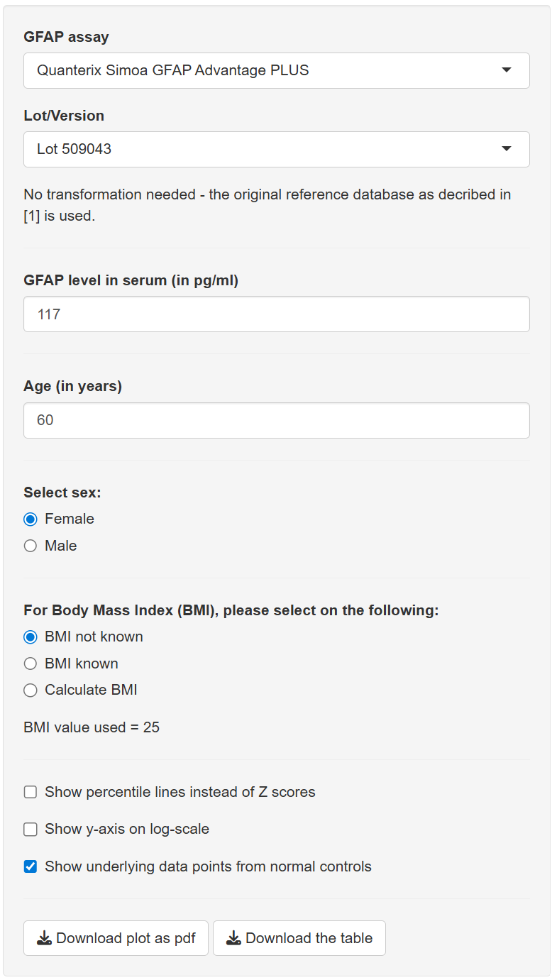 Provide age, GFAP levels, sex, and body mass index to automatically receive adjusted percentiles and Z scores.