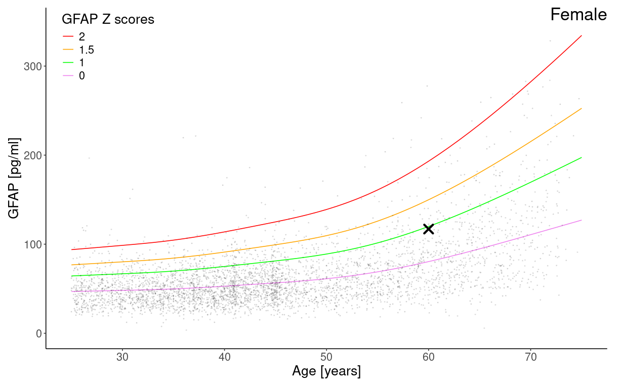 Get an immediate visual representation of your data with respect to values in the GFAP reference database (i.e. versus same age healthy controls).